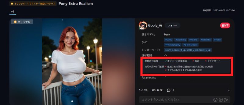 ブログやSNSでの利用はOKでも、グッズ販売や広告収入などに繋がる「商用利用」は、より厳しいルールが適用されることが多いです。SeaArt.aiの規約、および使用したモデル・LoRAのライセンスで「商用利用が可能か」を必ず確認してください。不明な場合は、商用利用は避けるのが安全です。