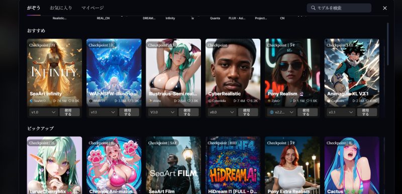 SeaArt.aiの大きな特徴の一つが、多種多様な「モデル」を選べることです。モデルによって、生成される画像の画風(リアル系、アニメ系、ファンタジー系など)が大きく変わります。