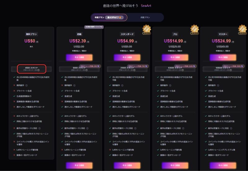 SeaArt.aiの無料プランでは、毎日一定数の「スタミナ」や「トークン」と呼ばれるポイントが付与されます。画像を1枚生成するごとに、このポイントが消費される仕組みです。