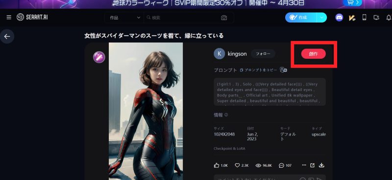 最初のうちは、「どのモデルを選ぶべきか?」「パラメーターの設定はどうすればいいのか?」「プロンプトやネガティブプロンプトの記述が分からない」など迷うことも多いかと思います。そんな時は、慣れるまで他のクリエーターの作品の中から希望に近いものを選んで「創作」するのがおススメです。「創作」ボタンを押すことで、その作品のモデルやパラメーター設定、プロンプトが反映されます。そこから少しづつ変えていきながら生成のやり方を覚えるのが近道です。