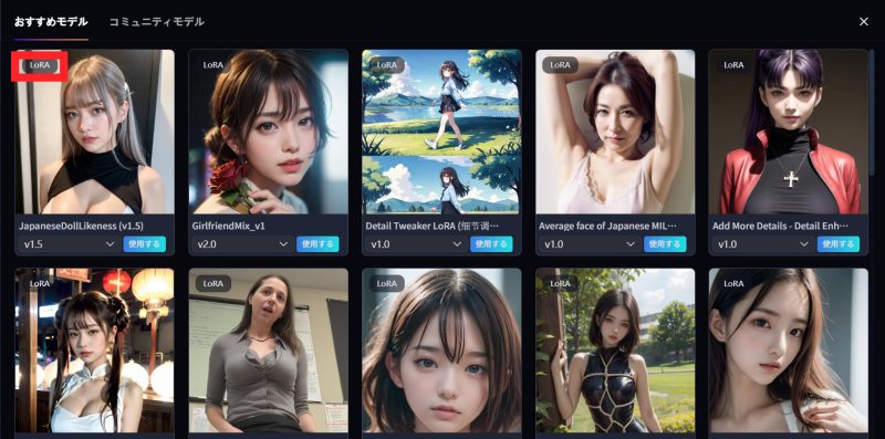 SeaArt.aiの強力な機能の一つが「LoRA(ローラ)」です。これは、特定の画風、キャラクター、服装、ポーズなどを追加学習させた「追加ファイル」のようなもので、これを適用することで、ベースとなるモデルだけでは出せない表現が可能になります。