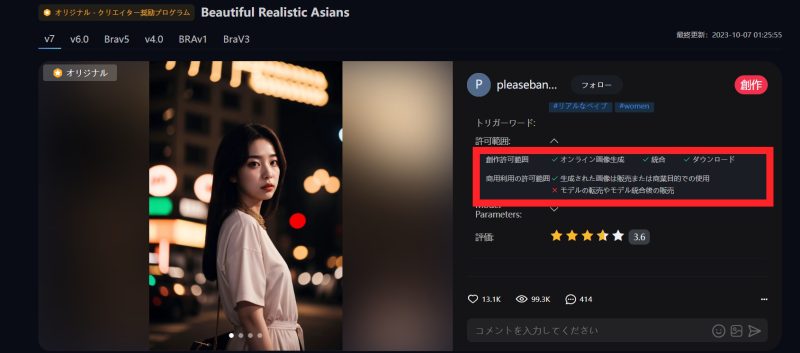 モデル・LoRAのライセンス: SeaArt.ai内で利用できるモデルやLoRAは、それぞれ制作者が異なる場合があり、個別にライセンス(利用条件)が設定されています。特に、特定のキャラクターやイラストレーターの画風を模倣したものは、商用利用が禁止されていたり、利用に制限があったりすることが多いです。画像生成画面でモデルやLoRAを選択する際に、ライセンス情報を確認する項目があるはずなので、必ずチェックしましょう。安易に商用利用したり、無断で再配布したりしないように注意が必要です。